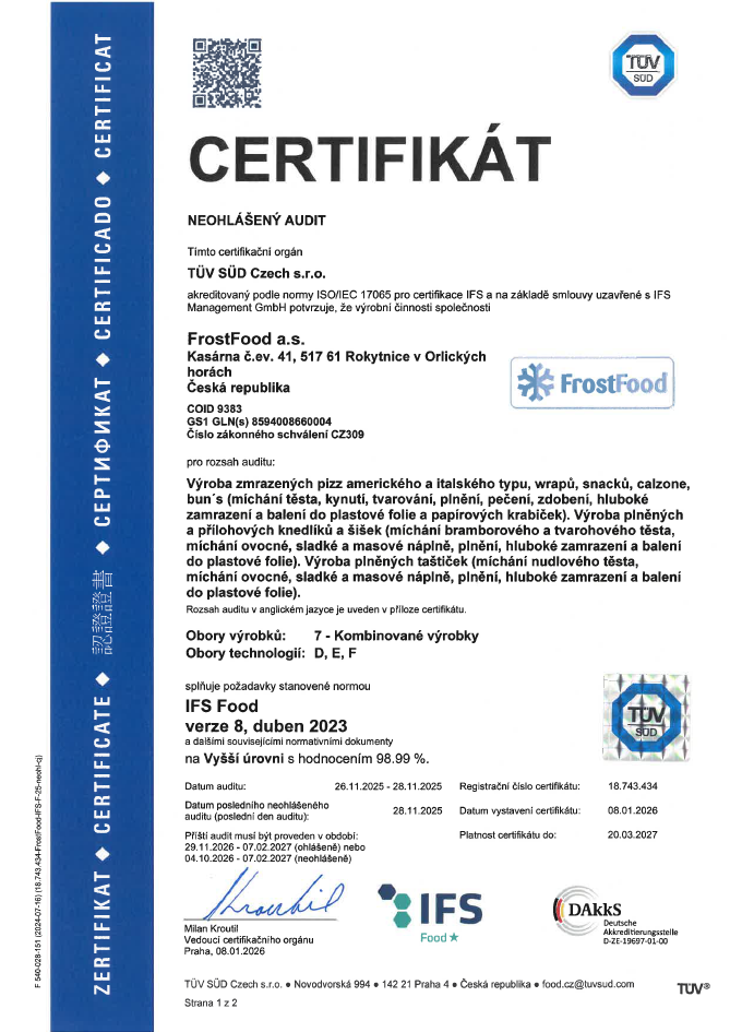 Interní mechanismy zabezpečení kvality a bezpečnosti potravin jsou nastaveny dle požadavků normy IFS. Systém HACCP je plně implementován.
